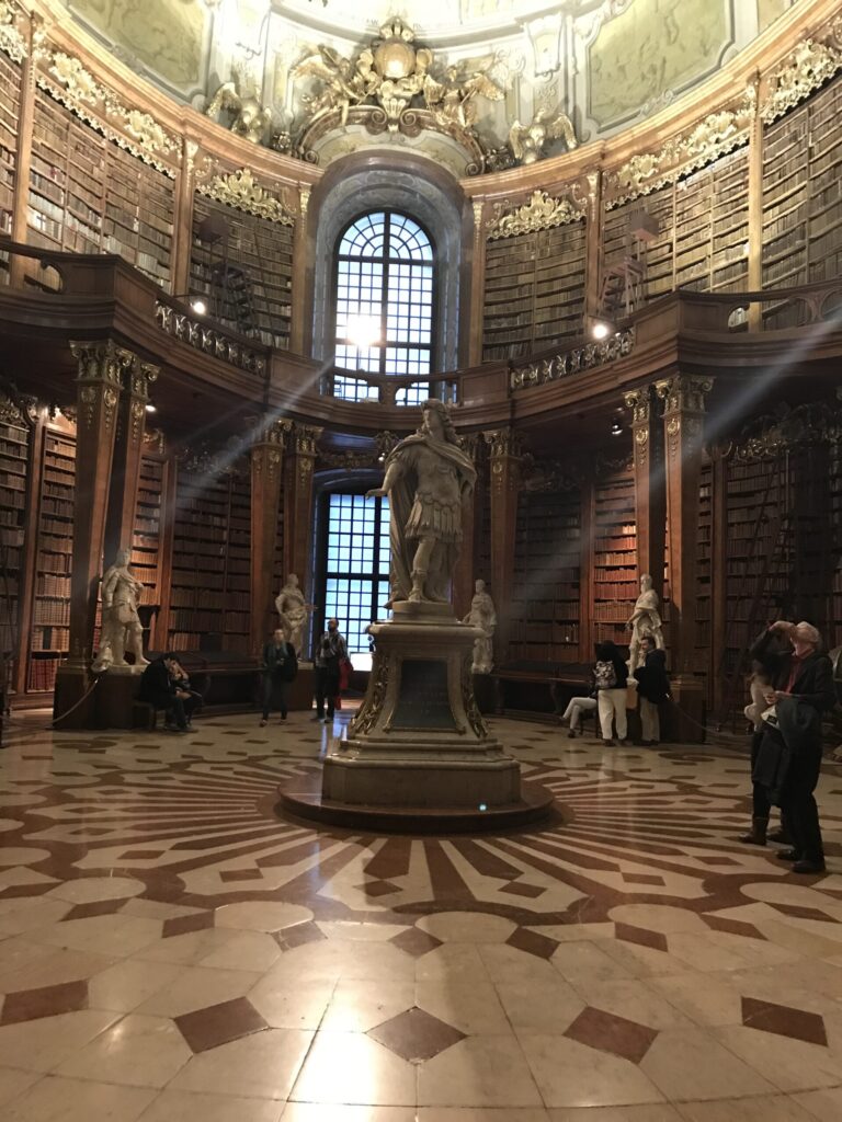 図書館というより優雅な宮殿、美術館のような国立図書館です。楕円形ホール中央にカール6世の彫刻がドーム真下にあり、神々しく光を浴びて一層際立っております。この図書館は場所が少し分かりづらいので迷う方が多いです。